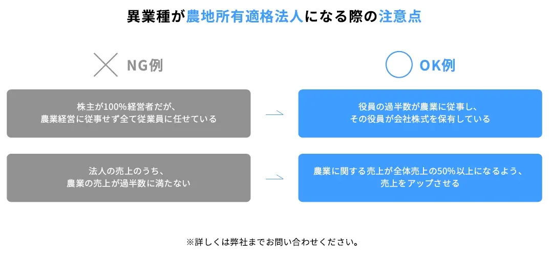 異業種から農業に参入する場合、本業の売上がいくらあるのかにもよりますが、農地所有適格法人となるケースが多いです。