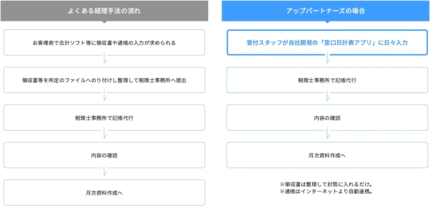 医療機関では、未だ紙ベースでの会計が主流となっていることが多いように感じています。弊社では、お小遣い帳感覚で使える「窓口日計表アプリ」という自社開発のWEBアプリケーションを無料で導入させていただき、医院と会計事務所側の双方でリアルタイムに現金出納帳を確認できるようにしています。これにより、進捗の把握やミスの低減に役立つほか、受付や経理をご担当されている奥様の作業時間を約90%削減できるようになりました。銀行預金やクレジットカードについてもAPI連携で自動入力でき、経理関係の入力作業も弊社に外注できますので、大幅な負担軽減を実現できます。
