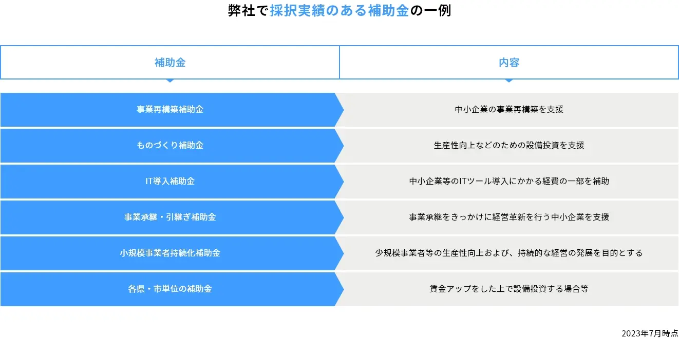 経済産業省または地方自治体が主体で、採択される企業の数が決まっています。そのため申請企業が多い場合は競争となります。事業再構築補助金、ものづくり補助金、IT導入補助金、事業承継引継ぎ補助金、小規模事業者持続化補助金などがあり、いずれも弊社で申請支援させていただいております。