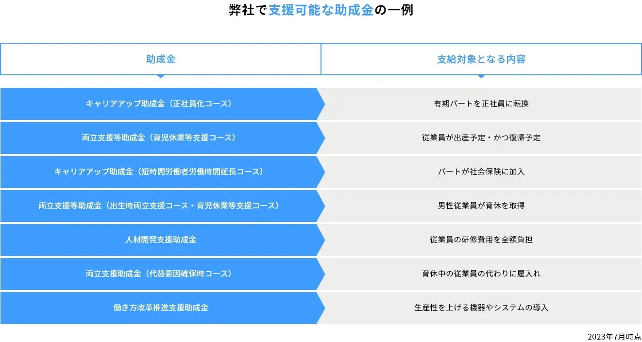 厚生労働省が主体となり、一定の要件を満たすことでほとんどの企業に支給されます。キャリアアップ助成金、両立支援等助成金、人材開発支援助成金などがあり、助成金の申請業務は弊社の社会保険労務士法人かぜよみで対応させていただきます。