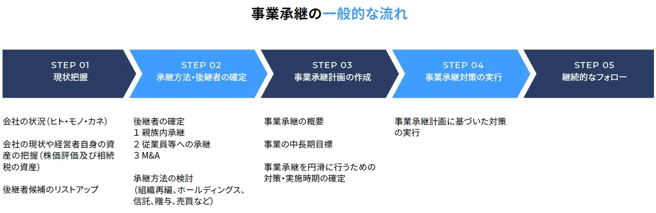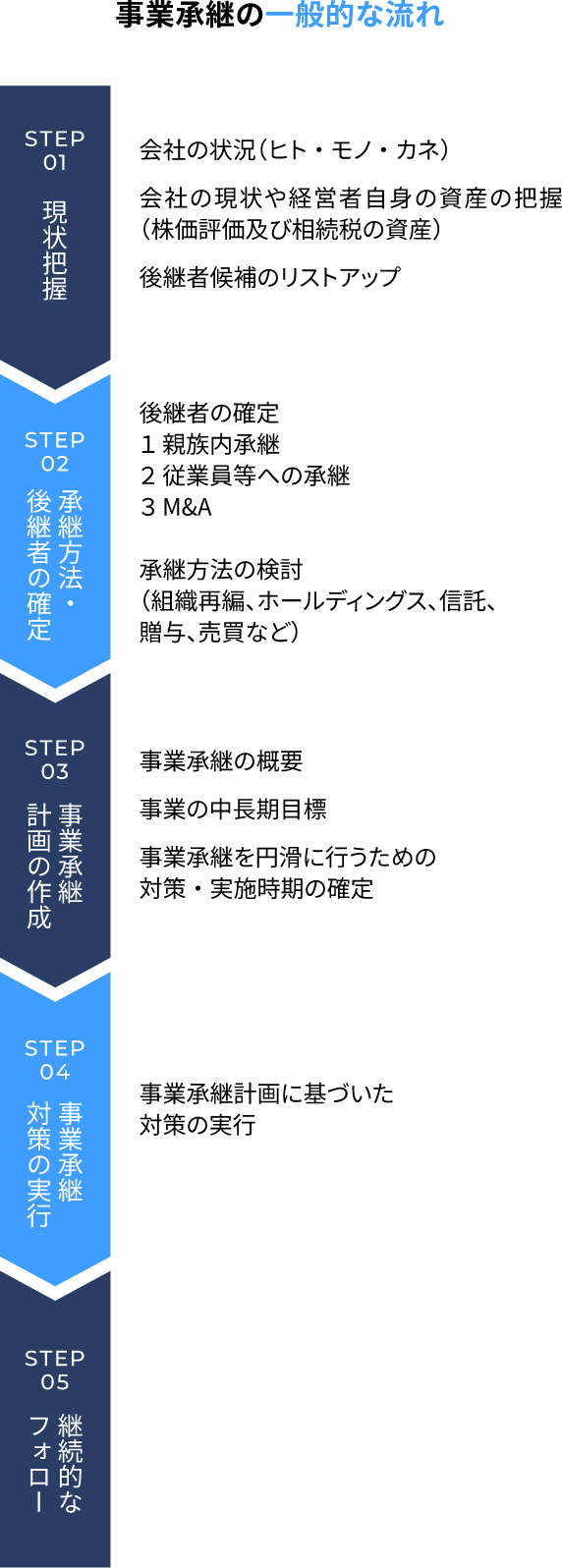一般的な事業承継を進める手順をご紹介いたします。私たちの経験上、事業承継には最低でも3年(できれば5年)の時間をかけたほうが、スムーズに進めることができます。また、事業承継の実績がある専門家に早めに相談することも重要です。
