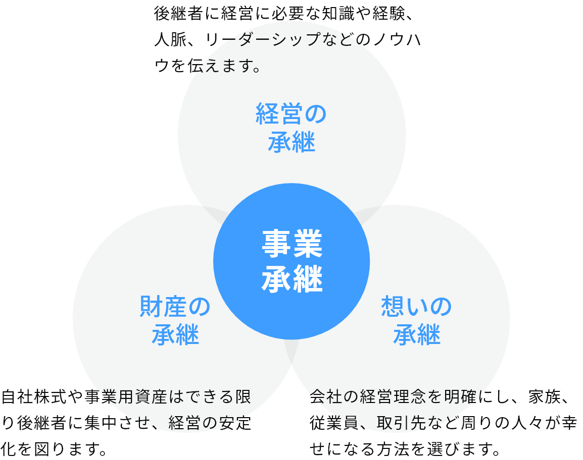 事業承継には「経営の承継」、「財産の承継」、「想いの承継」、が必要です。