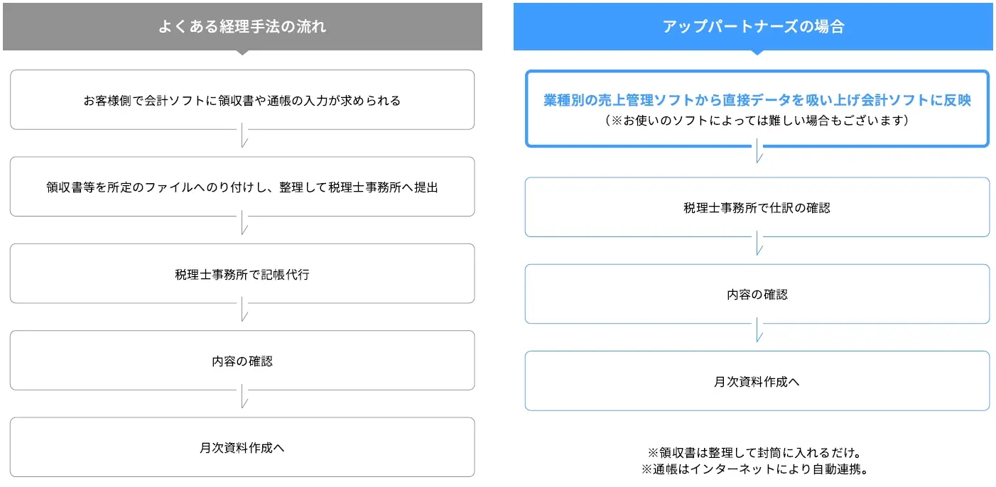 慢性的な人手不足が続くなか、経理業務は特に属人化しやすく、時間や労力を大幅にロスしている企業様も多くいらっしゃいます。アップパートナーズは、グループ内にシステムエンジニアが在籍し、業界でもいち早く経理の省力化や業務平準化に取り組んできました。これまであらゆる業種・規模の事業所様で豊富な実績を積んでおります。経理業務での課題はお気軽にご相談ください。