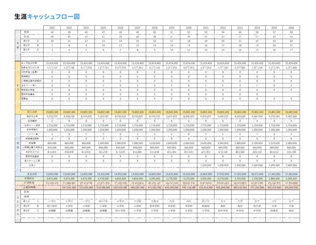 理想の歯科医師人生を歩むためには設備資金と教育資金、老後資金を考える必要があります。シミュレーションシステム「みらいプログラム」では、開業から老後まで約45年間のライフプランを試算し、長期的な視点から見た設備投資の検討や不安を払拭するために必要な収益目標を共に検討いたします。