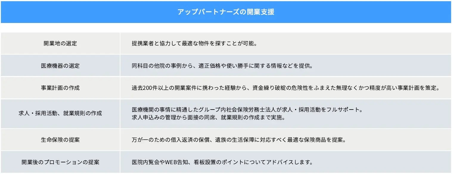 以前、他社が作成した開業計画について、銀行から弊社に再作成の依頼がありました。診療内容と収入内訳を拝見したところ、これまで弊社で開業支援した歯科医院と比較して差異があったため、診療行為別の患者数と単価を計算。開業当初の収入予測を現実的な数字に修正し、当初運転資金などの追加計上や初期の資金繰りショートのリスク軽減を実施しました。その結果、融資を受けられることになり無事開業できたという事例があります。これも、過去150件以上の歯科クリニック開業に関わってきたノウハウがあるからこそできることです。