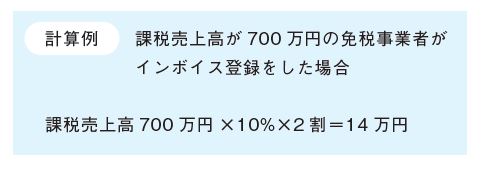 免税事業者からインボイス発行事業者になった方は令和5年10 月1日~令和8 年9 月30 日を含む課税期間(個人事業者は令和5年10 月~12 月の申告から令和8 年分の申告までが対象)については、売上税額(売上高×10%(軽減税率は8%))の2割を消費税の納税額とすることができます。
