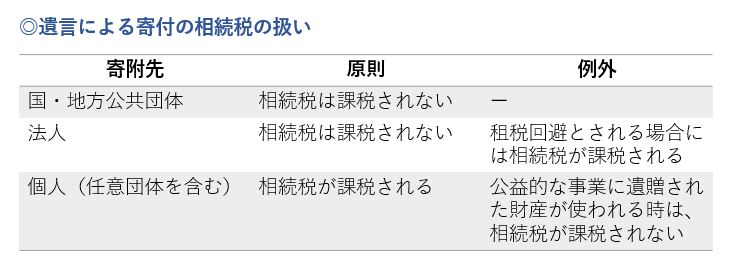 相続税は、相続又は遺贈により財産を取得した個人に課される税金です。そのため遺言により寄付を受けた法人は、相続税を不当に減少させるために行われた行為(いわゆる租税回避)とみなされない限り相続税は課税されません。