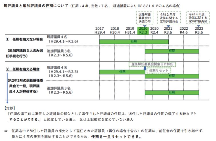 経過措置の終了に伴い、任期が異なる評議員が存在することを嫌い、全員の任期を合わせるために、令和 2 年 3 月某日にそれまでの評議員全員に一旦、辞任してもらい、即日、評議員 を選任している法人もあるかと思いますが、この場合も同様に、評議員全員の任期は、令和 5 年 6 月に開催される定時評議員会の終結の時までとなります。