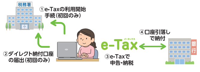 e-Tax(国税電子申告 ・ 納税システム)により申告書等を提出した後、納税者ご自身名義の預貯金口座から即時又は指定した期日に口座引落しにより国税を電子納付する手続きです。利用するに当たり、事前にe-Taxの利用開始手続と届出書(口座情報の登録)の提出が必要となります。