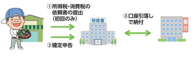 振替納税は申告所得税及び復興特別所得税、 消費税及び地方消費税(個人事業者)について利用が可能です。また、手数料は不要です。