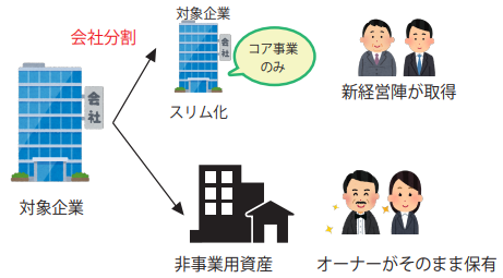例えば、事業会社に有価証券や生命保険、不動産といった非事業用資産が含まれている場合、事前に会社分割を行うことで、事業と資産を切り離せます。これにより、オーナーは非事業用資産を引き続き保有できます。