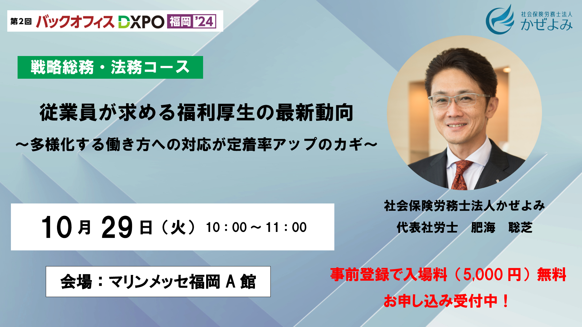 管理部門の業務効率化・DX推進のための展示会「バックオフィスDXPO福岡’24」の 専門セミナーに、弊社代表社労士・肥海が登壇いたします。