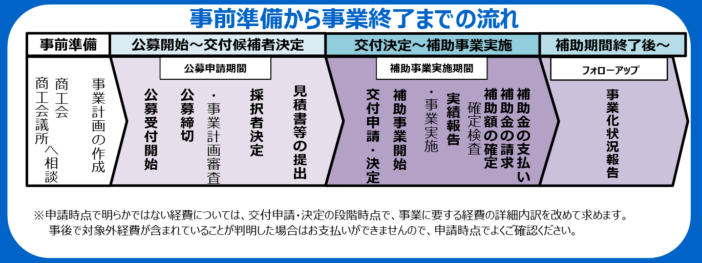 基本的には、小規模事業者自身が、経営計画・補助事業計画等の策定時や採択後の補助事業の際に商工会・商工会議所の支援を受けながら取組む事業です。商工会の承認等も必要なので、作成に時間がかかります。