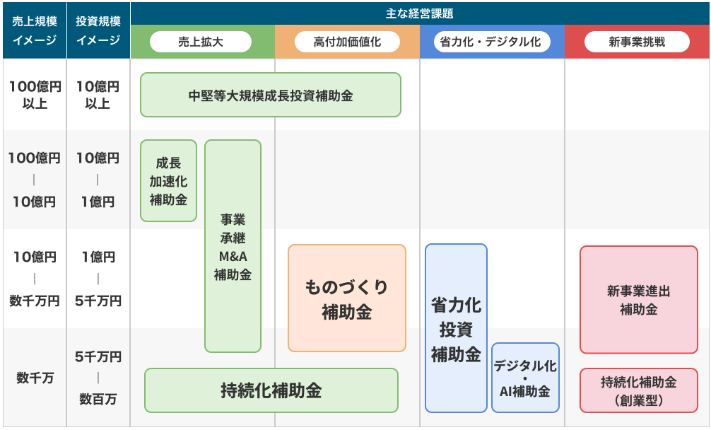 各補助金の解決課題や投資規模につきましては、こちらをご参照ください。