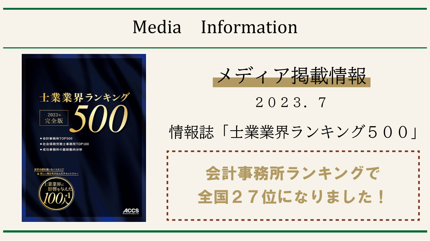 アックスコンサルティング社が発行する「士業業界ランキング500(2023年完全版)」で、アップパートナーズが全国27位、社労士法人かぜよみが全国23位として紹介されました。