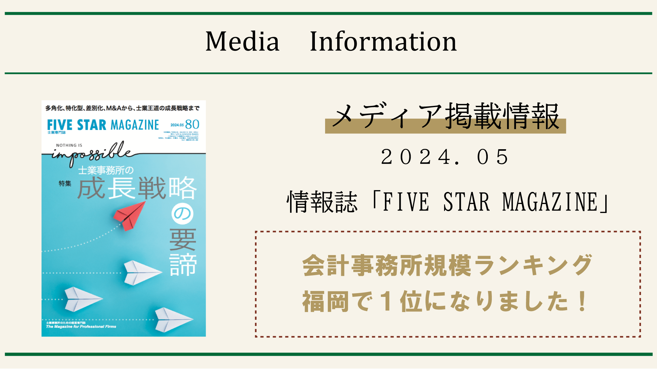 士業専門誌「FIVE STAR MAGAZINE」80号の2024年度会計事務所規模ランキングで、税理士法人アップパートナーズが福岡で1位として紹介されました。