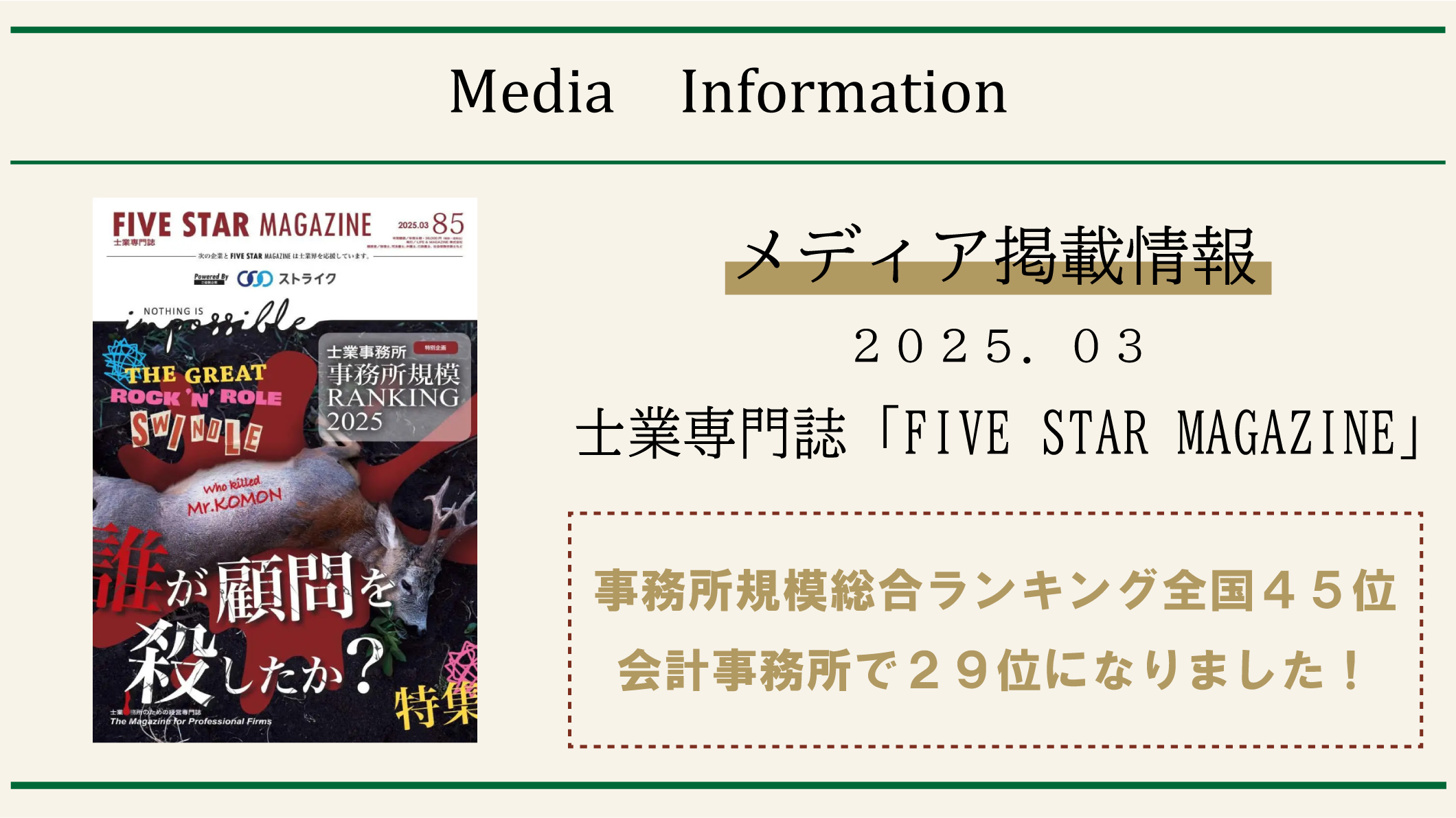 士業専門誌「FIVE STAR MAGAZINE」85号の2025年度事務所規模ランキングで、税理士法人アップパートナーズが士業事務所規模総合全国45位、会計事務所規模全国29位として紹介されました。