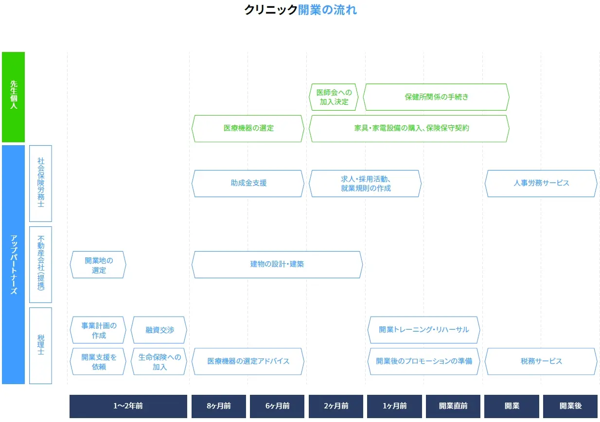 上記の図のように、個人医院が開業に向けてすべきことは多岐にわたっており、それらを支援するために医療機器メーカーや薬局、設計士などさまざまな業者が携わっています。医院の開業において税理士法人は、事業計画の作成や資金繰りなどで関わることとなります。そこで必要になるのが、診療単価や診療圏分析から得られる実際の患者数など数多くの経験値です。