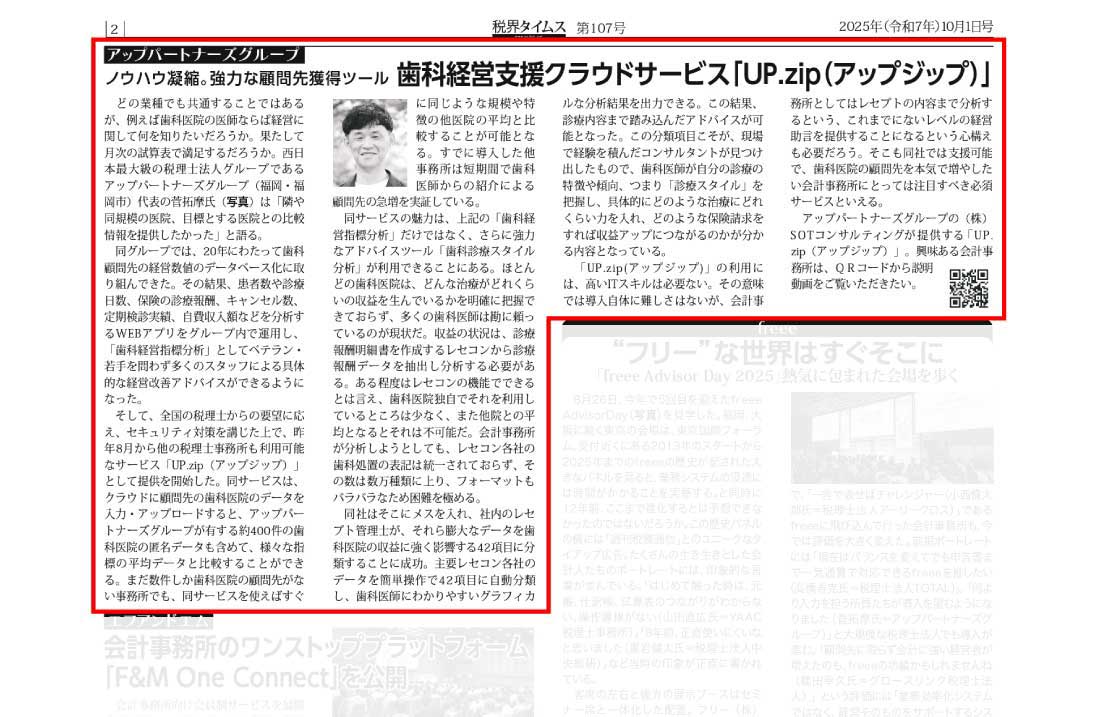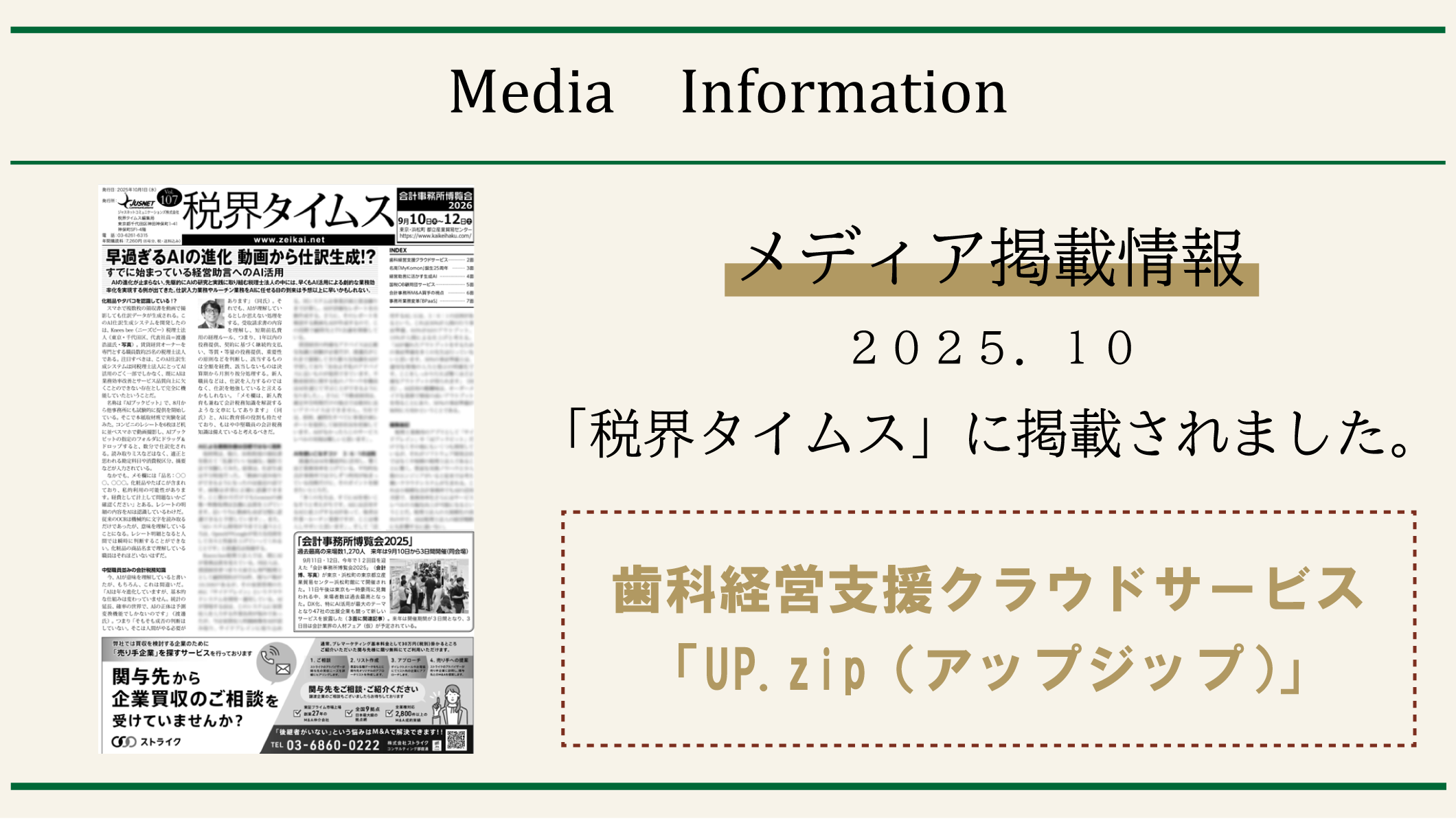 10月1日発行の「税界タイムス」第107号にて、当社の歯科経営支援クラウドサービス「UP.zip(アップジップ)」が紹介されました。